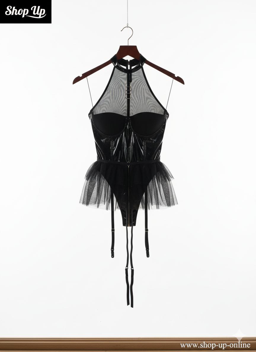 • طراحی فانتزی و اغواگرانه: این بادی با فرم جذب، یقه هالتر، بخش‌های مشبک و زیپ مرکزی، جلوه‌ای جسورانه و مدرن دارد. دامن تور کوتاه نیز به آن حالتی بازیگوشانه و زنانه می‌بخشد.