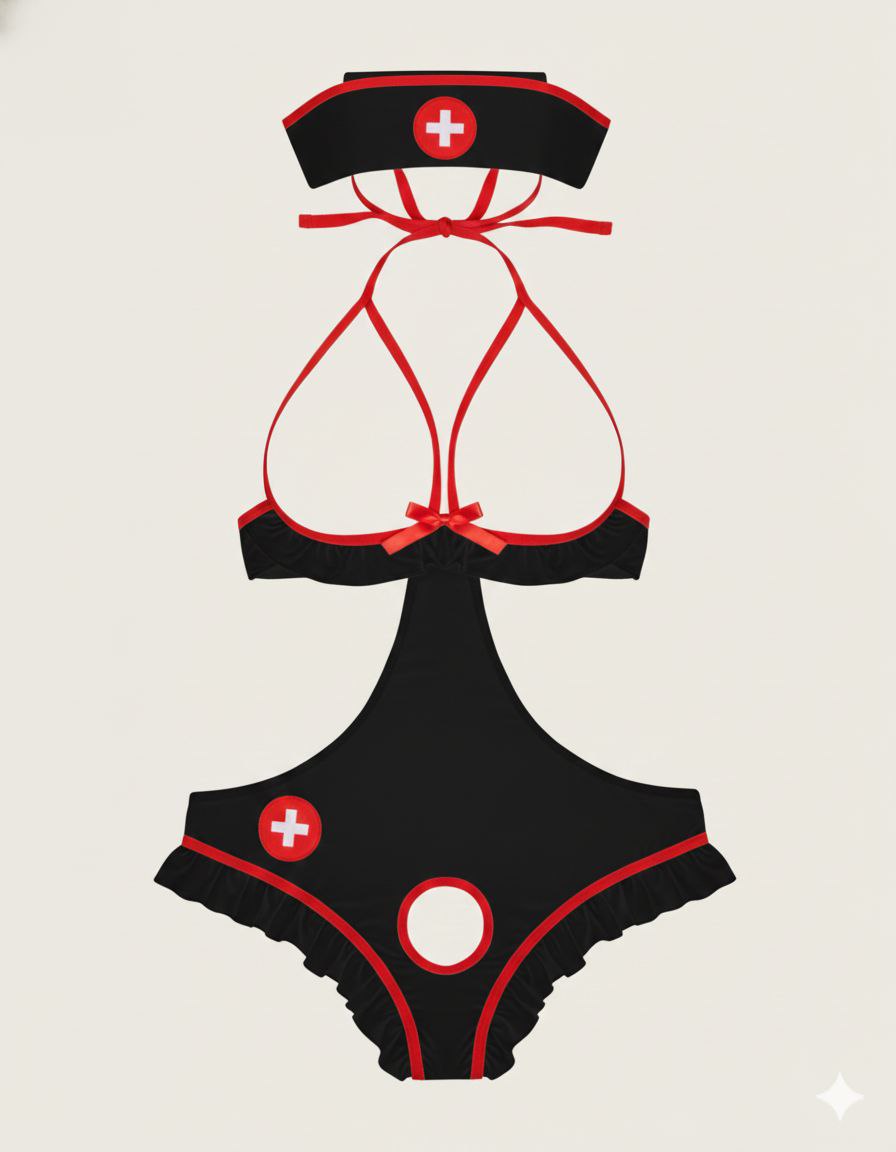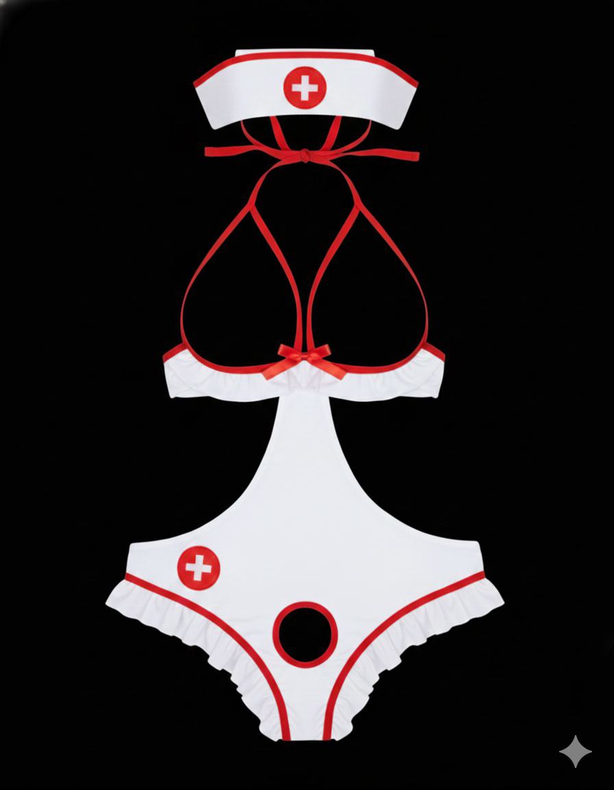 این کاستوم با الهام از یونیفرم پرستاری، اما با نگاهی جسورانه و مدرن طراحی شده است. جزئیات قرمز، لبه‌های چین‌دار و نماد صلیب قرمز در بخش جلویی لباس، حس بازیگوشی و جذابیت را به استایل شما اضافه می‌کند. پشت لباس نیز با طراحی باز و بندهای قابل تنظیم، جلوه‌ای خاص و تحریک‌آمیز دارد.